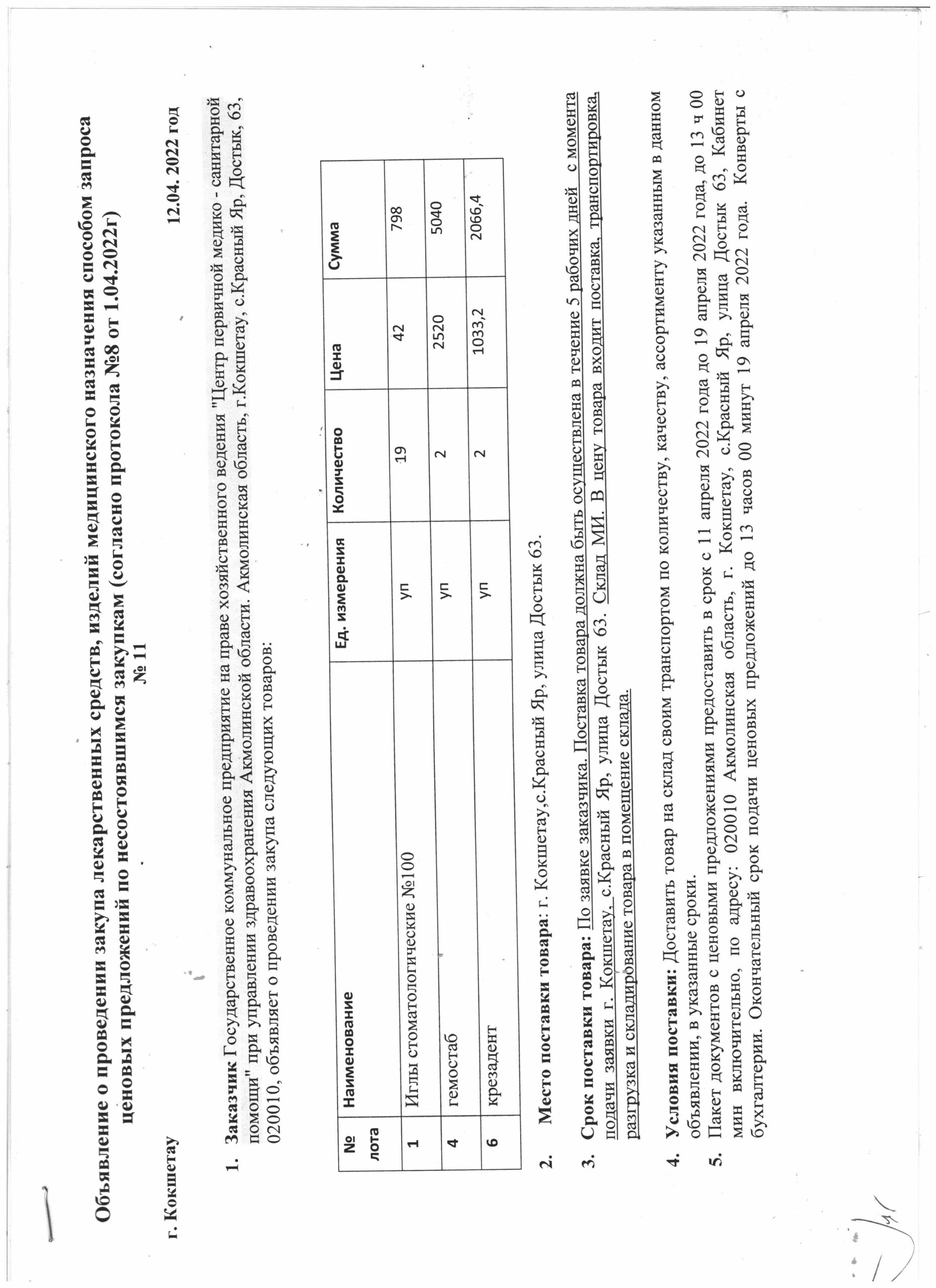 Объявление о проведении закупа лекарственных средств способом запроса ценовых предложений по несостоявшимся закупкам согласно протокола № 8 от 01.04.2022 г. Автор: admin · 12 апреля, 2022